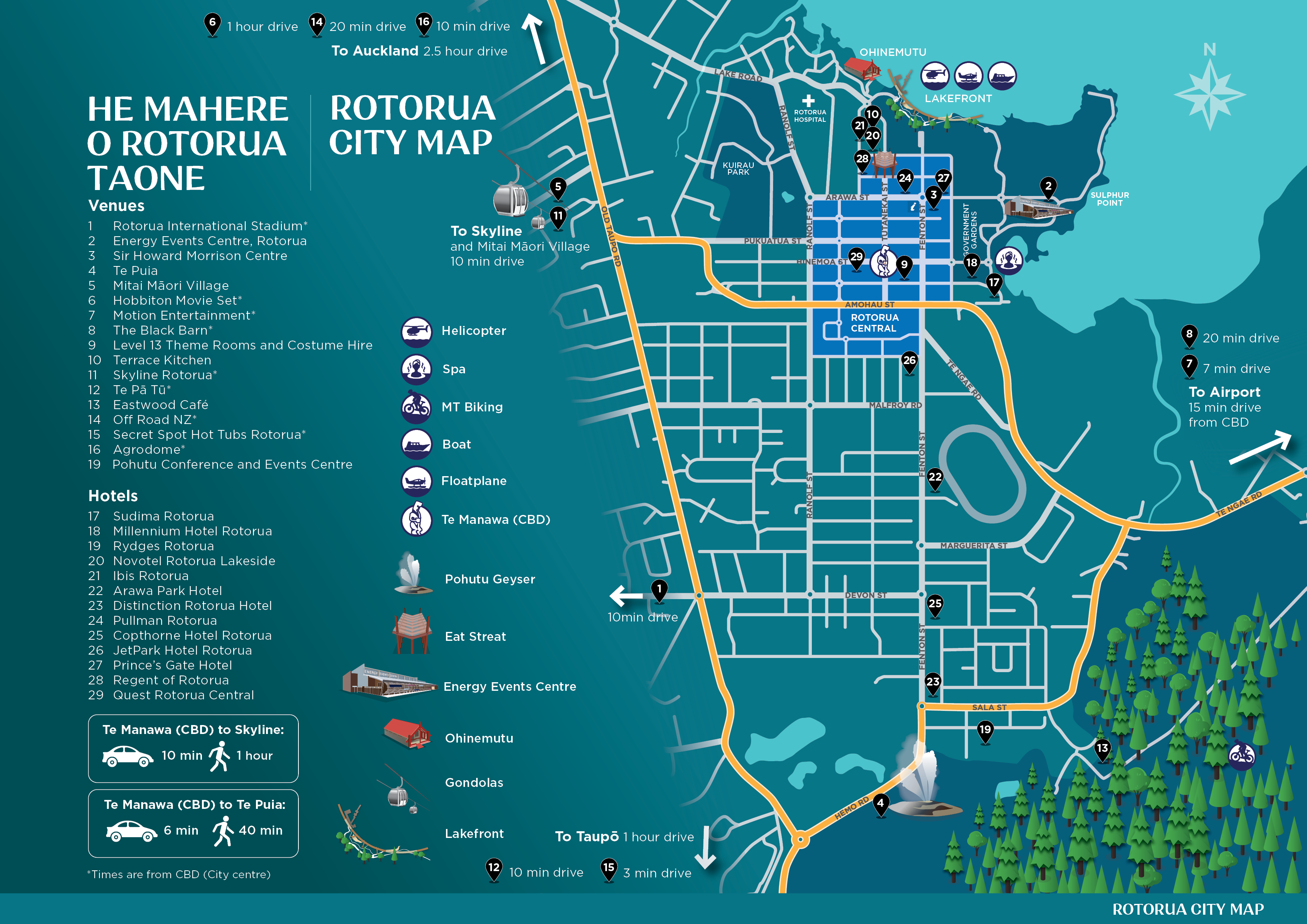Rotorua has a range of accommodation options as well as a virbrant food and beverage offering. To view the various offerings on the city map - please see below (click on map to enlarge).
